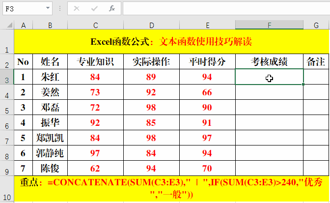 公式中首先利用Sum函数计算个人的总分,然后用IF函数判断总分的情况是“优秀”还是“一般”,最后用Concatenate将总分,“ | ”和判断的结果连接起来。