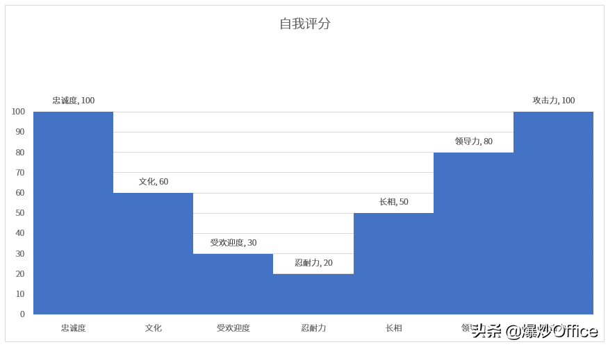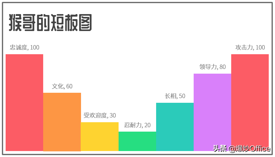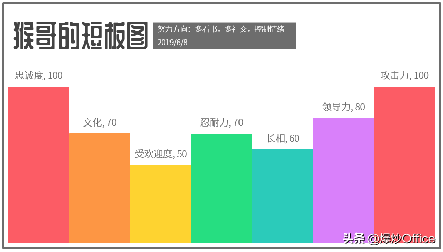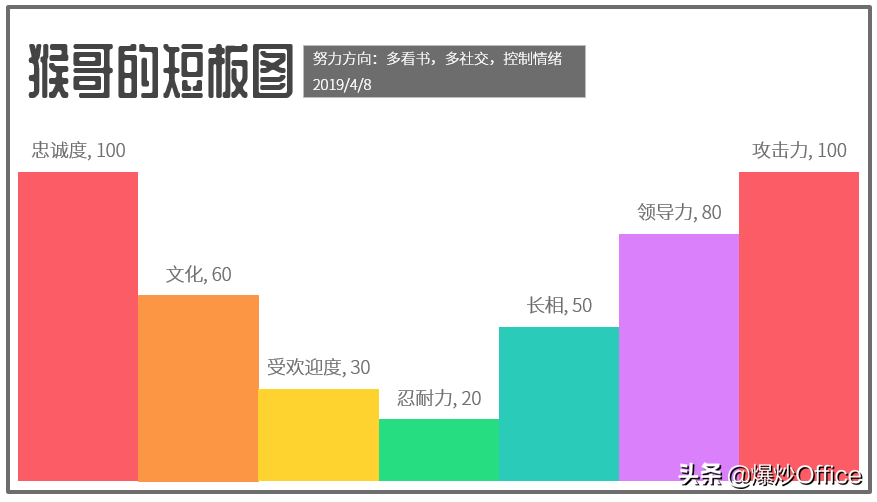 古人"三省"的时候可能是坐在那闭目冥想,或者背着手在梨树下踱步,或者抬着头凝视着夜空。而现今,却可以坐在电脑前"自省",借助Excel,把自己的长短处直接画出来,得到下图所示的"短板图",长短板一目了然。越矮的柱子就是自己越短的短板。
