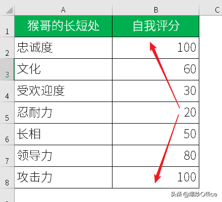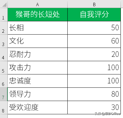 打开Excel,在工作表中输入自己的长处和短处,并进行自我评分(100分制、10分制皆可)。不妨用猴哥作为示例(数据胡编乱造,猴哥切莫生气)。