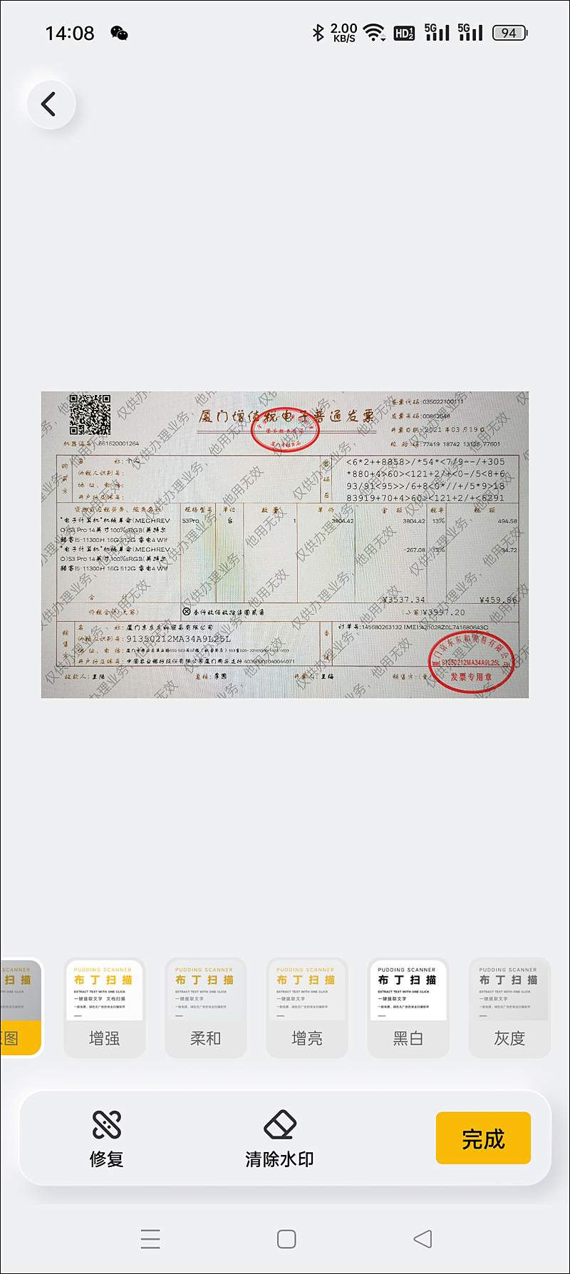 以扫描发票为例,只需对准发票纸张(或电子版图片)拍照,布丁扫描会自动裁切无关内容生成发票的PDF格式文档,还能根据实际需求添加自定义的水印,然后导出到本地或发送给QQ/微信。