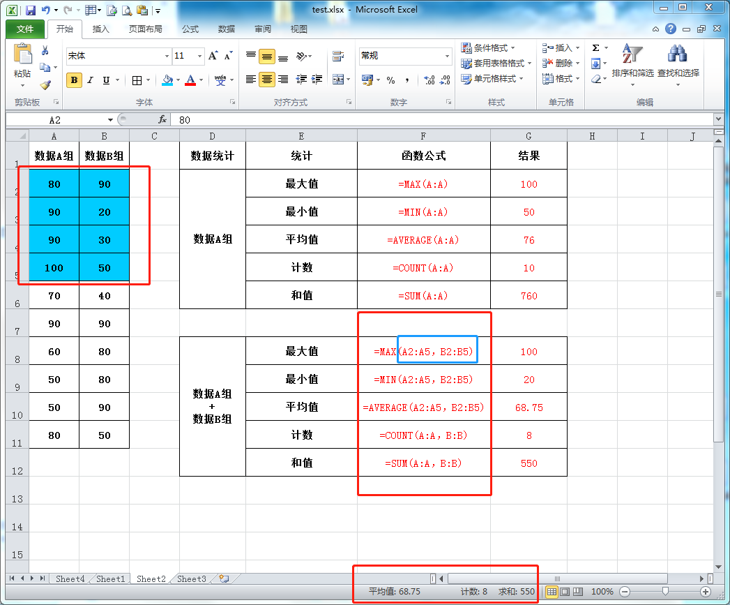 如分析多列的指定区域数据,公式范围就填写为(A2:A5,B2:B5),不同列用逗号分隔;