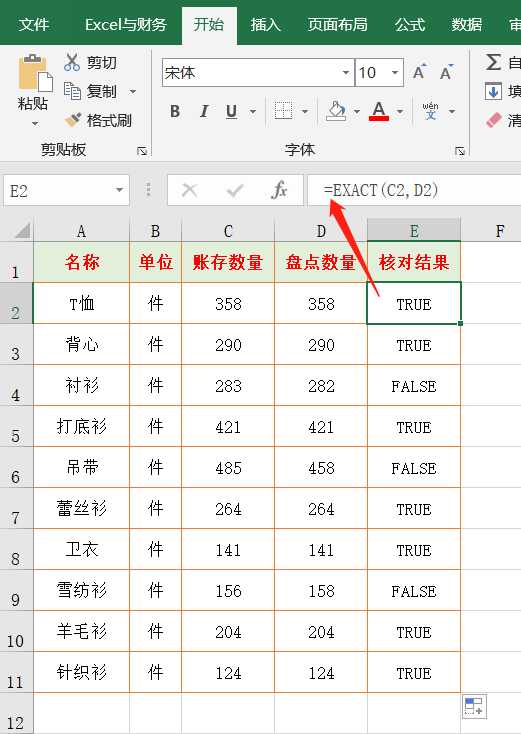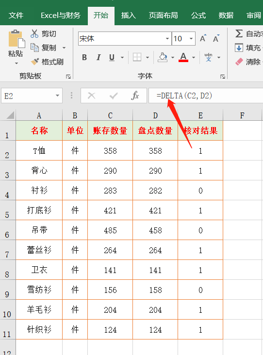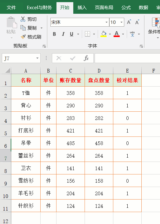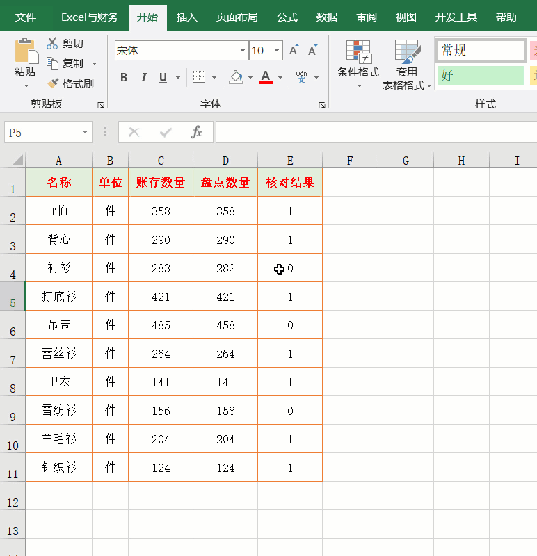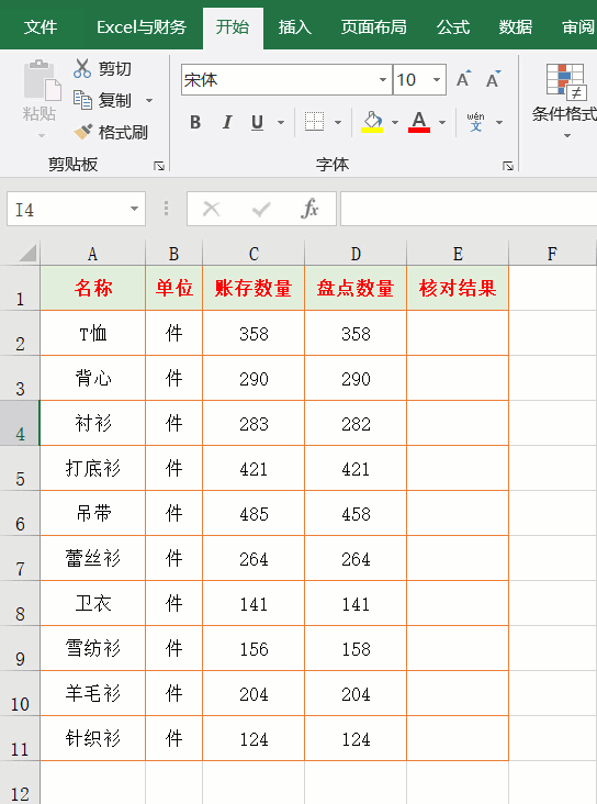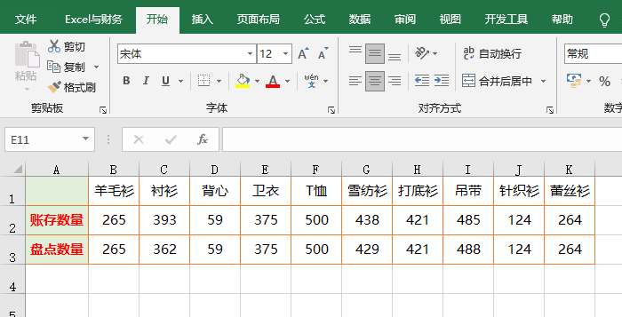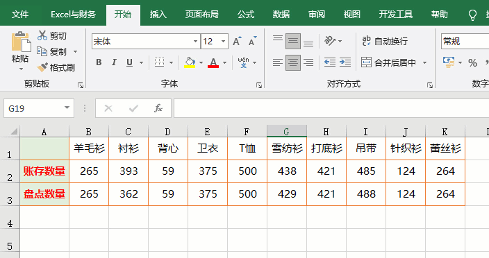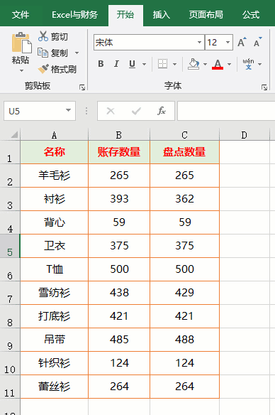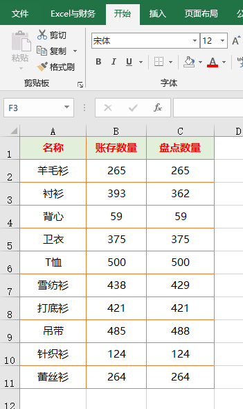 ①核对两列数据:表格中需要对商品的"账存数量"和"盘点数量"对比找出差异数据。