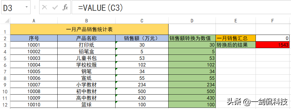 说明C列的数不能计算,这就需要将其转换为数值格式。