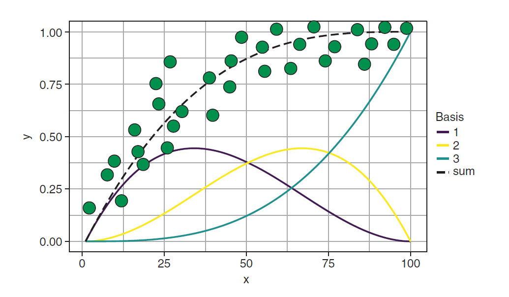 就是说广义可加的原理就是,先弄几个好解释的基础函数,这个基础函数可以是一次的,也可以是多次的,然后再将这些基础函数进行线性组合,从而达到更好地拟合数据的目的。