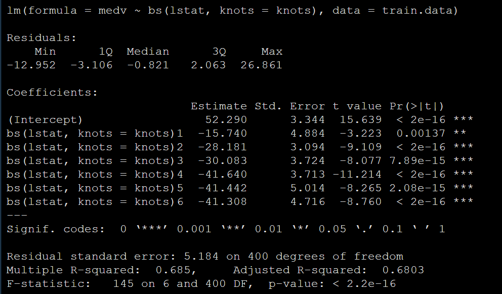 model <- lm (medv ~ bs(lstat, knots = knots), data = train.data)