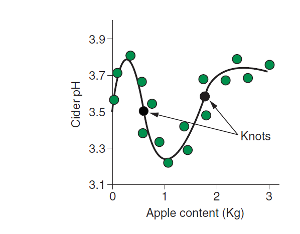 A spline is a piecewise polynomial function. This means it splits the predictor variable into regions and fits a separate polynomial within each region, which regions connect to each other via knots.
