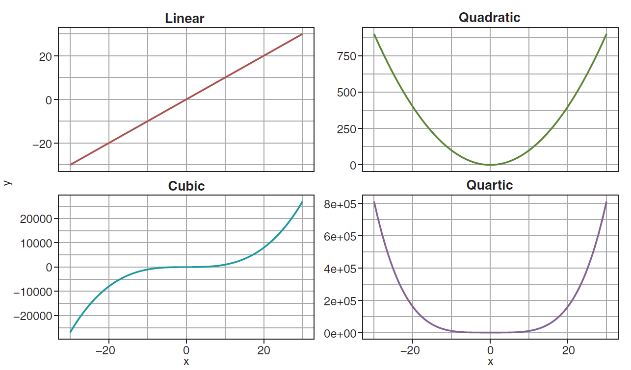 上面的只是一个2次项拟合的例子,我们其实经常会遇到有可能高次式会把数据拟合的更好,社科论文中其实也常常见到做高次回归的,常见的1次,2次,3次,4次项英文论文中的表达,曲线形状如下: