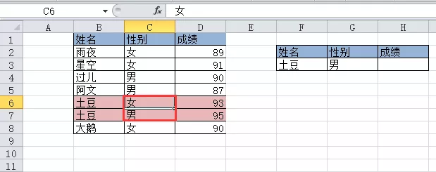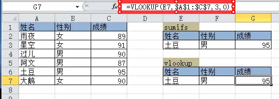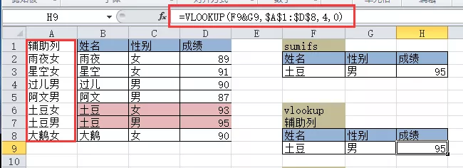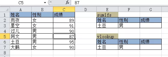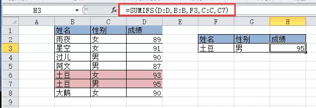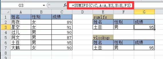 如果有同名同姓但性别不同,如图例如名叫土豆的有两个人,但性别不同。这种情况下用sumifs函数就比vlookup函数简单。