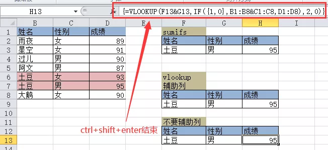 如果不加辅助列则会使用到数组公式,在理解和输入上都会相对麻烦一些,在H13单元格输入公式=VLOOKUP(F13&G13,IF({1,0},B1:B8&C1:C8,D1:D8),2,0),按ctrl+shift+enter三键结束公式编辑栏。