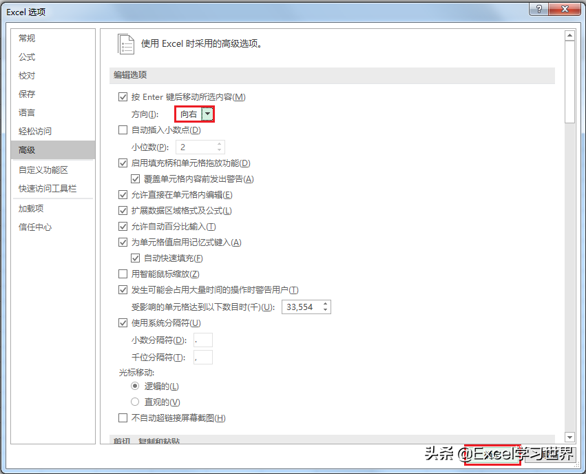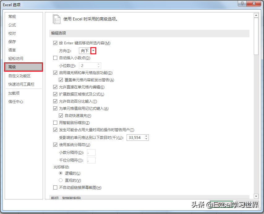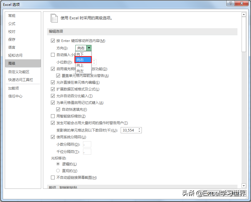 2. 在弹出的“Excel 选项”对话框中选择“高级”--> 在“编辑选项”区域可以看到“按 Enter 键后移动所选内容”下面的方向默认是“向下”--> 将它改成“向右”--> 点击“确定”