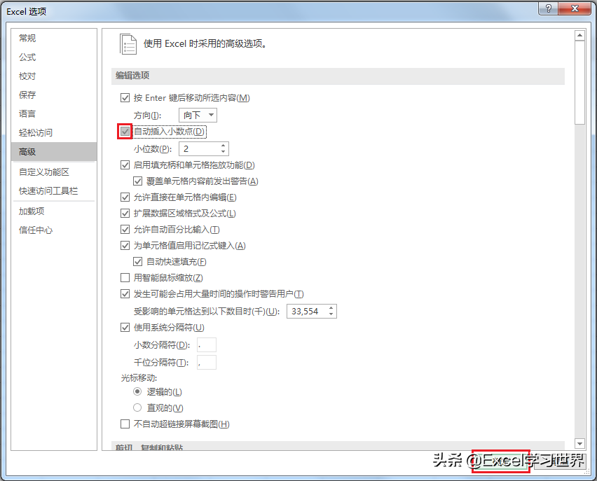 2. 在弹出的“Excel 选项”对话框中选择“高级”--> 在“编辑选项”区域勾选“自动插入小数点”,默认的小数位为 2 位,满足本例需求 --> 点击“确定”