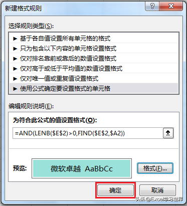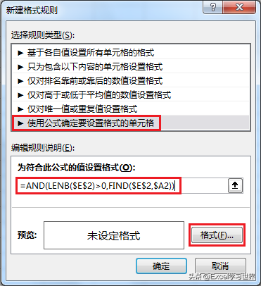 3. 在弹出的对话框中选择“使用公式确定要设置格式的单元格”--> 输入以下公式 --> 点击“格式”: