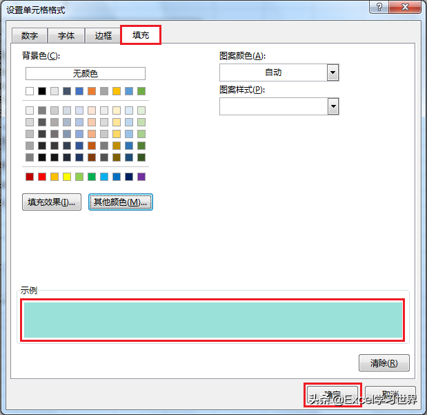 4. 在弹出的对话框中选择“填充”选项卡 --> 选择所需的填充色 --> 点击“确定”