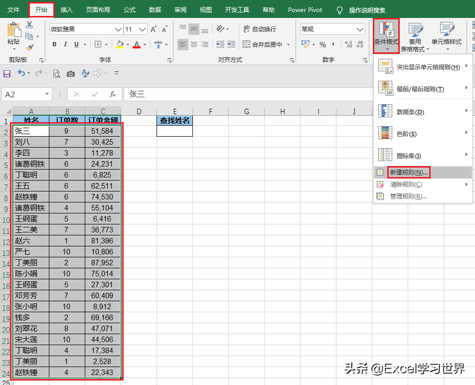 2. 选中 A2:C24 区域 --> 选择菜单栏的“开始”-->“条件格式”-->“新建规则”
