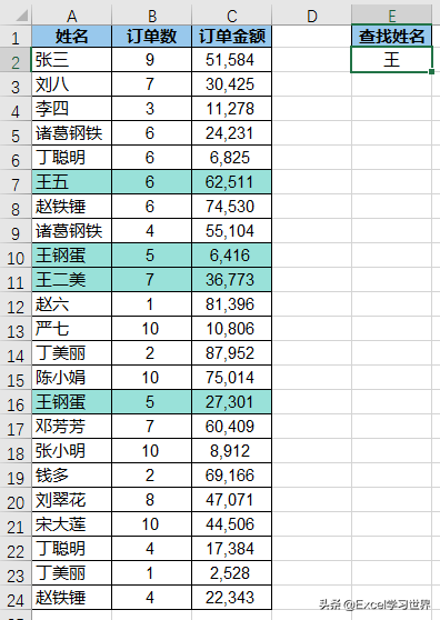 现在就设置好了:当 E2 单元格中输入的内容与左侧数据表中的姓名模糊匹配时,相关行都会自动显示成绿色。