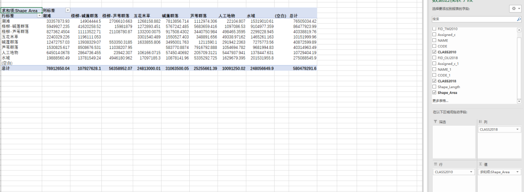 - 数据透视表制作转移矩阵,行2010年地类,列2018年地类,求和项为面积