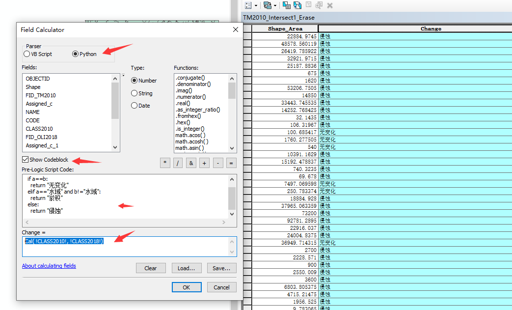 需要注意的是,我前面用的是汉字,下面代码里面判断的是地类编码,由于ArcGIS中Python2对于汉字支持不太好,所以还是建议判断数字。
