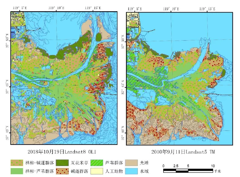 图1. 黄河口2010,2018主要植物群落和土地覆被分布