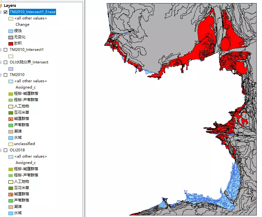 - 在TM2010_Intersect1减去OLI水陆分界_Intersect(输出要素类:TM2010_Intersect1_Erase)