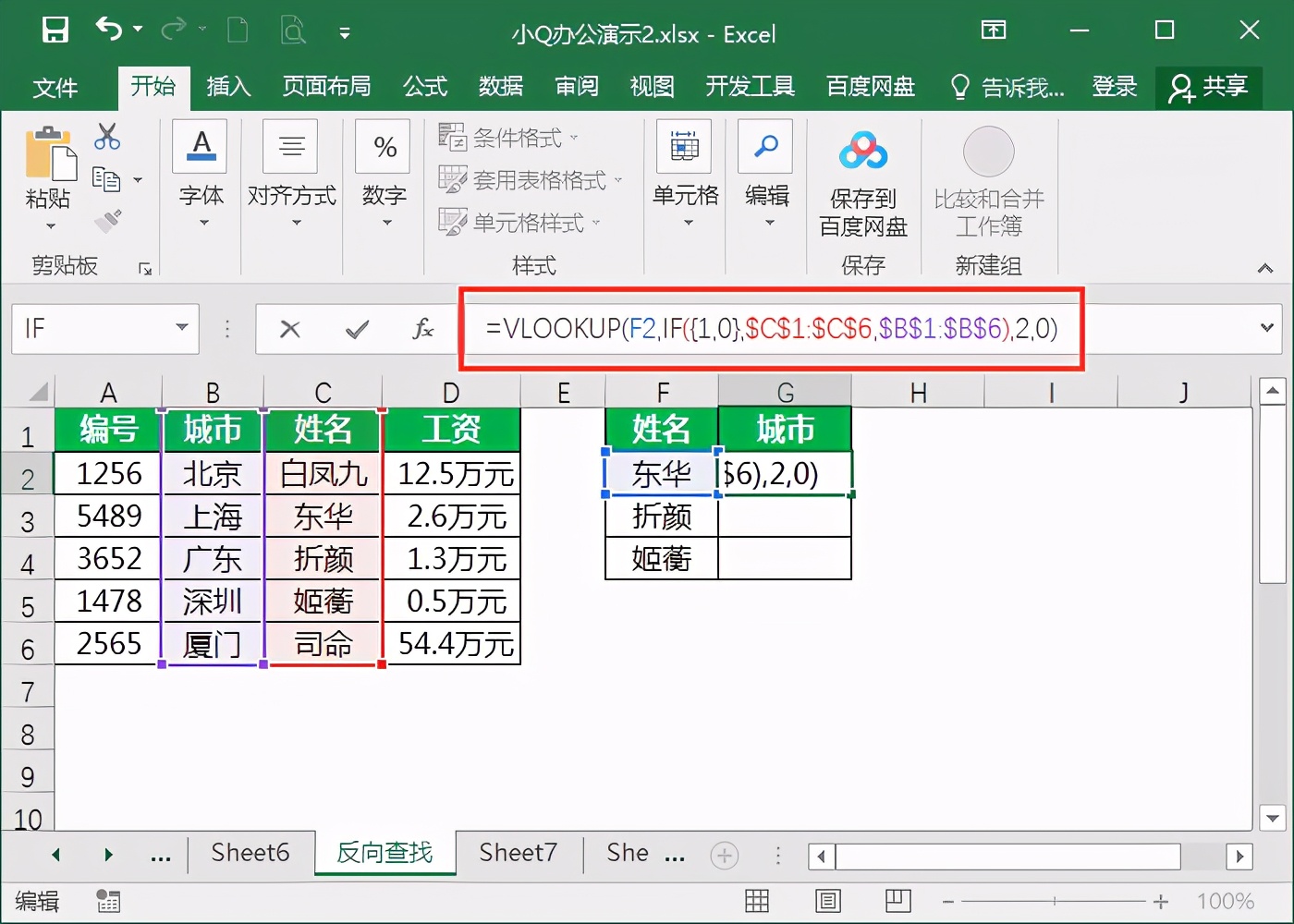 2、可以在单元格中输入公式=VLOOKUP(F2,IF({1,0},$C$1:$C$6,$B$1:$B$6),2,0),其中IF({1,0},$C$1:$C$6,$B$1:$B$6)表示新创建一个以姓名在前,城市在后的两列查询表。