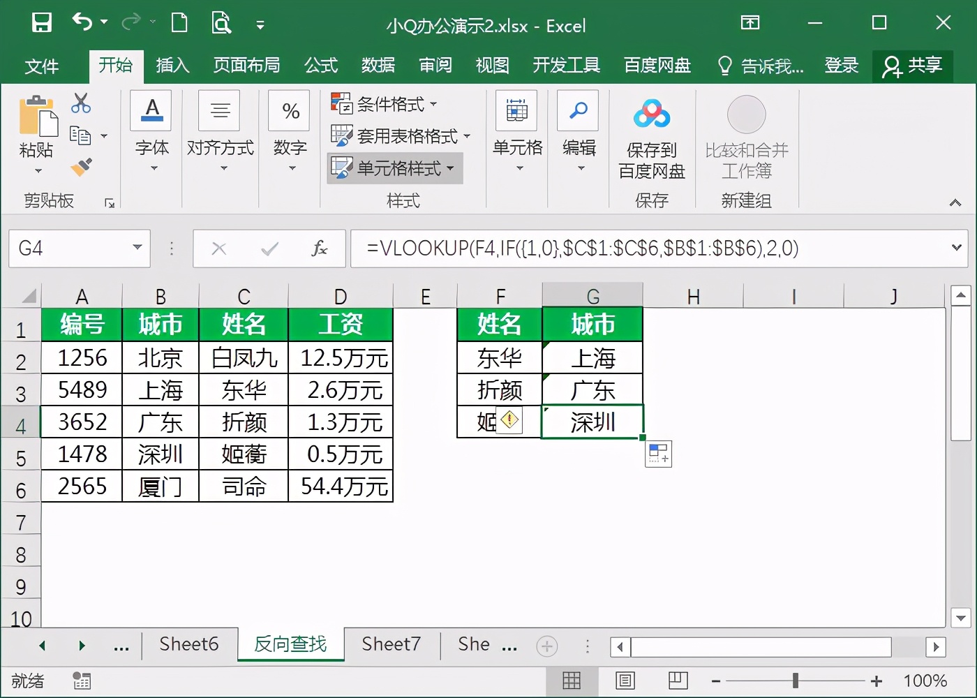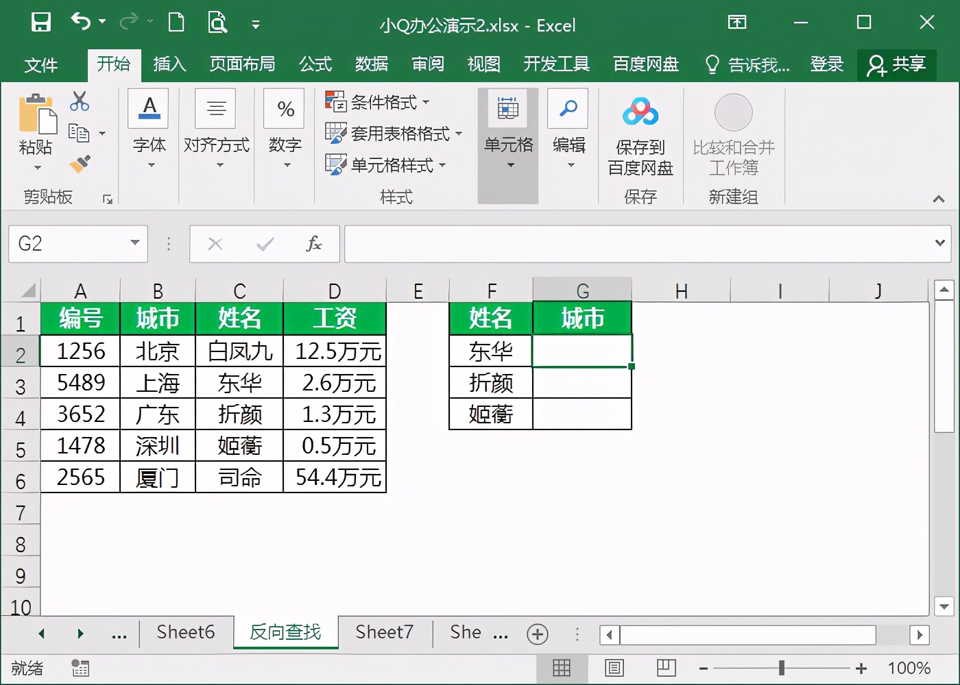 1、如下图我们要通过姓名查找对应的城市,但是在查询表中城市排列在姓名之后,这样查询就形成了反向查询。