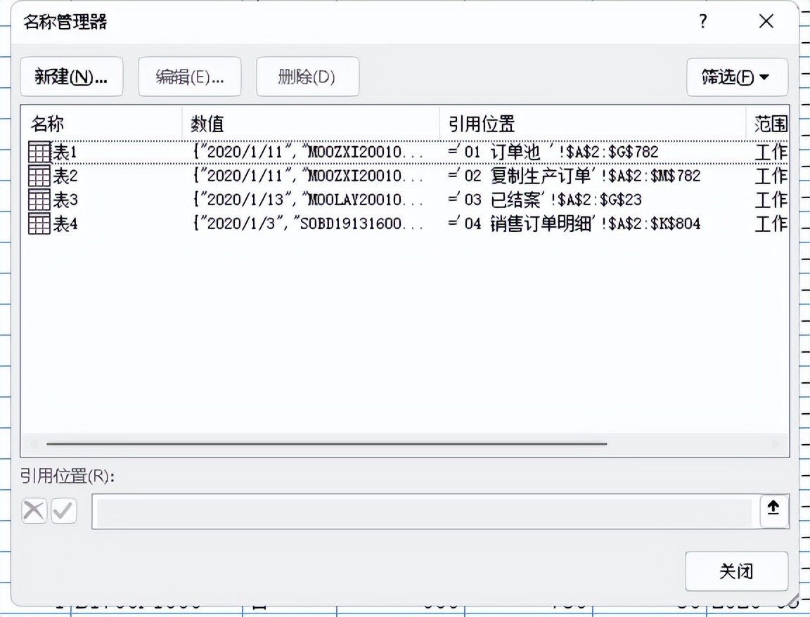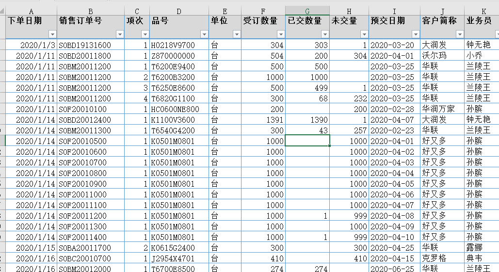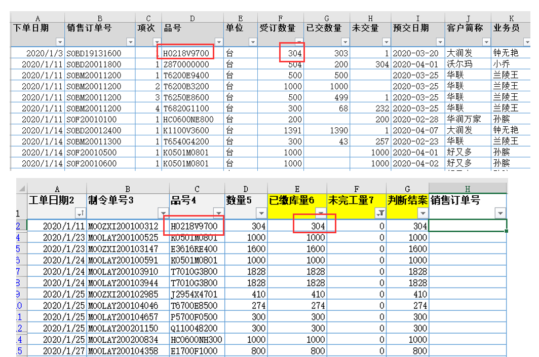我们为了快速排程,我们把订单的信息可以快速地引用到订单池中,方便我们做数据分析,注意表1订单池的顺序保持不变,统计按下单日期升序排序;都是未结案的;在引用销售订单号的时候,我们发现ERP系统这边没有带出对应工单号;所以这里没办法直接引用;