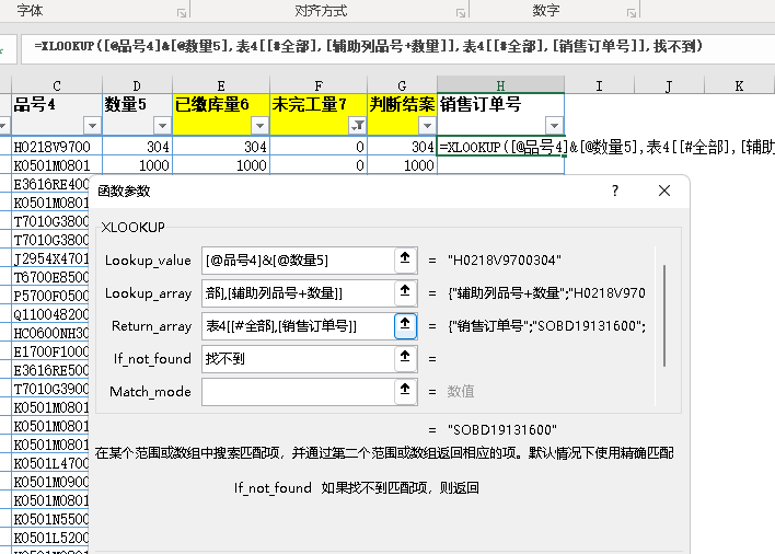 =XLOOKUP([@品号4]&[@数量5],表4[[#全部],[辅助列品号+数量]],表4[[#全部],[销售订单号]],"找不到")