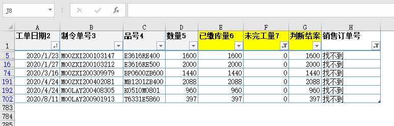 通过观察发现,只需要把品号和下单数量两个条件一起判断,就大概率可以找到销售订单号;录入公式=[@品号]&[@受订数量]