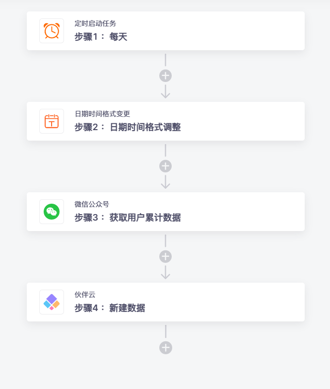 企业开展营销活动期间,需要格外关注微信公众号运营数据,比如新增关注人数,取消关注人数,净增关注人数,累积关注人数等汇总到伙伴云表单,通过数据看板分析此次活动策划是否存在问题,但企业人员在此时间段常忙于活动筹划,根本无暇顾及登录后台筛选查看。因此,市场运营人员常常在想这一套流程是否可以实现自动化?