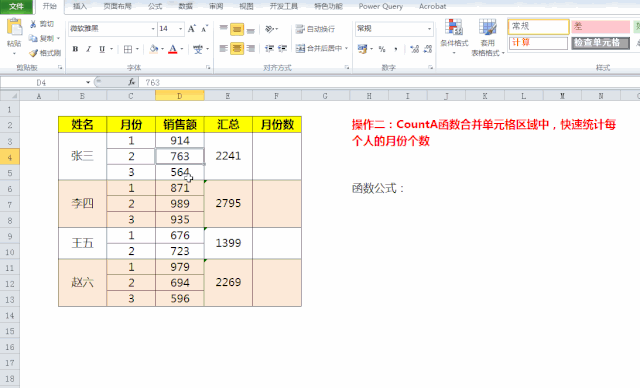 操作二:CountA函数合并单元格区域中,快速统计每个人的月份个数