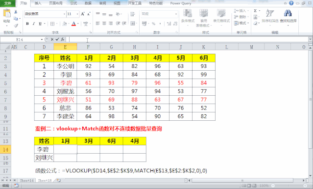 案例说明:如上图所示,我们需要统计李碧、刘继兴特定月份的数据。月份是不连续的而且位置也是无序的。这种情况的数据查询,利用vlookup+Match函数一样可以快速实现。