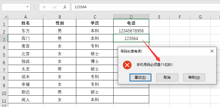 在“信息表”中输入个人的联系电话,只能输入11位数。