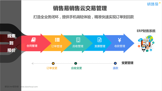 ——“交易管理”前面对接了销售易线索到报价流程,后面通过高效的导入/导出API连接了ERP财务系统,将准确的财务数据输入到ERP中,帮助销售人员、管理层和财务进行定期的数据分析和跟踪,了解回款状况,及时发现问题,采取相应的行动。