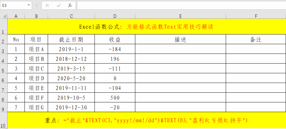 在目标单元格中输入公式:="截止"&TEXT(C3,"yyyy!/mm!/dd")&TEXT(D3,"盈利0;亏损0;持平")。