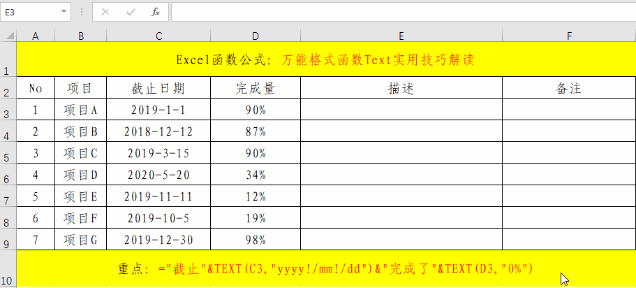 在目标单元格中输入公式:="截止"&TEXT(C3,"yyyy!/mm!/dd")&"完成了"&TEXT(D3,"0%")。