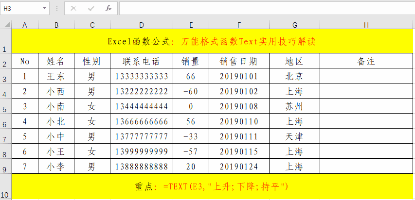 在目标单元格中输入公式:=TEXT(E3,"上升;下降;持平")。