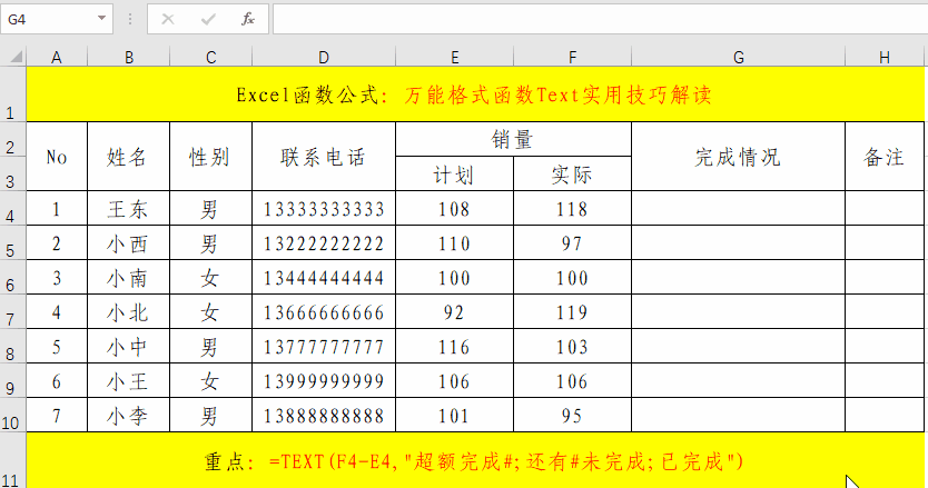 在目标单元格中输入公式:=TEXT(F4-E4,"超额完成#;还有#未完成;已完成")。