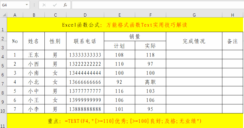 在目标单元格中输入公式:=TEXT(F4,"[>=110]优秀;[>=100]良好;及格;无业绩")