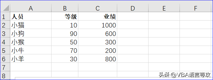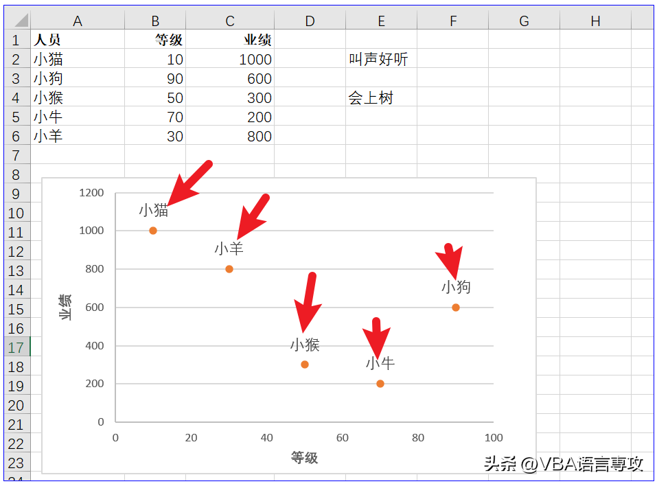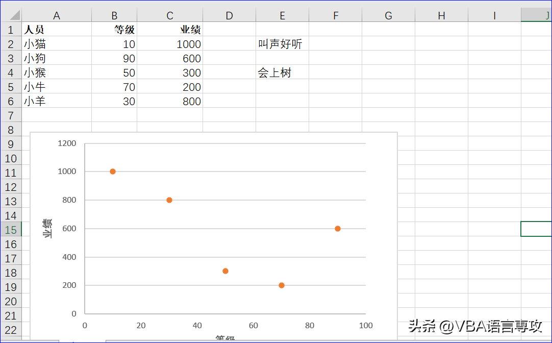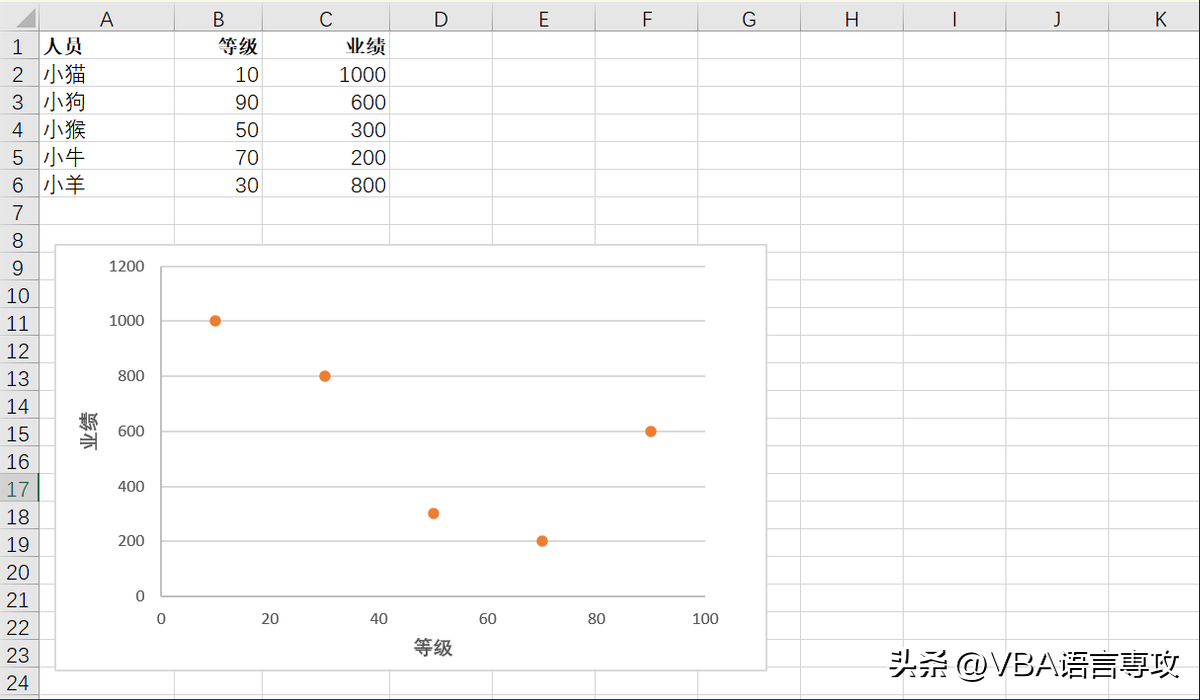 此时,各个数据对应的等级及业绩罗列分别在图表中展示了出来,但非常遗憾的是哪个点对应的是哪个人员无法在图表上显示。这是要在图表上使用标签了。