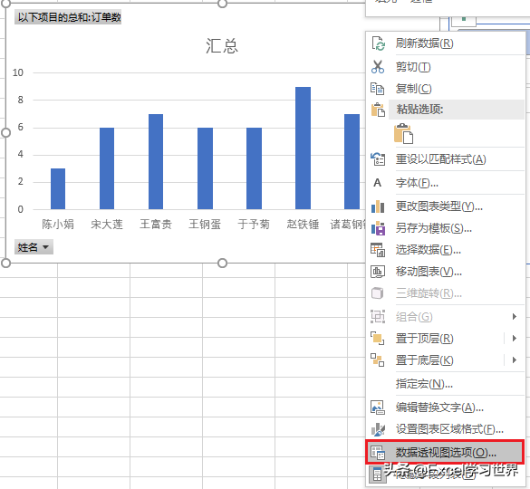 6. 选中数据透视图 --> 右键单击 --> 在弹出的菜单中选择“数据透视图选项”