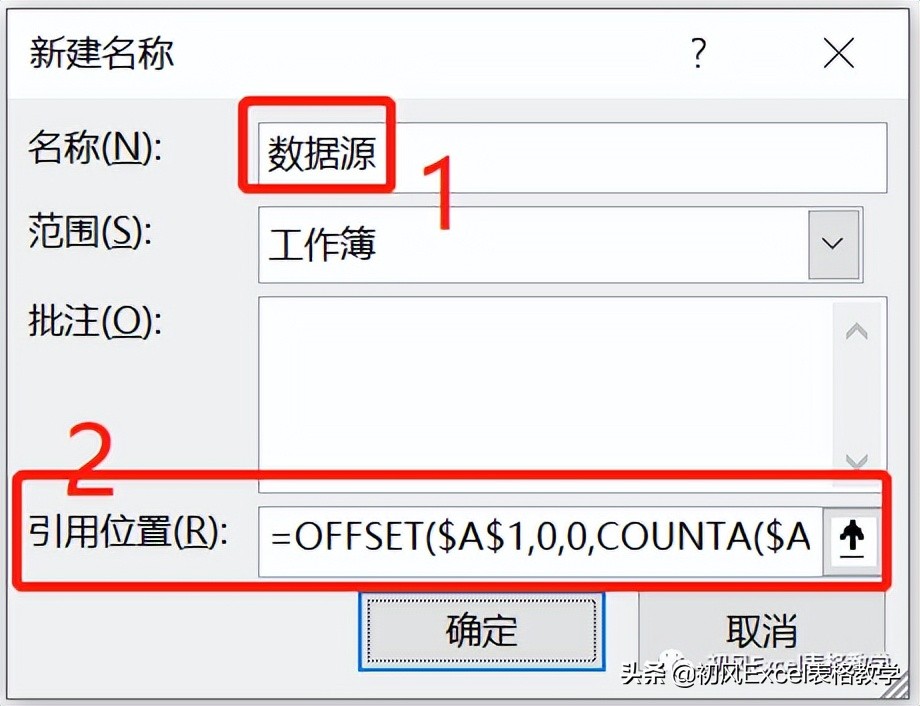 1、单击【公式】-【定义名称】,打开【新建名称】对话框。【名称】框中输入“数据源”;【引用位置】处输入公式: