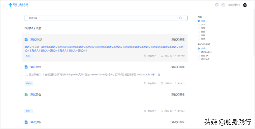 文档的搜索,企业级搜索引擎,支持文本名称、内容的搜索,查找内容更加方便。