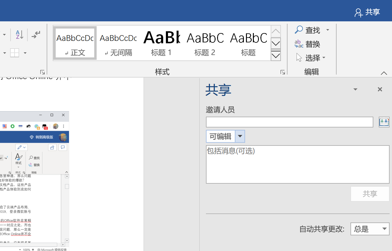 而Office Online最为吸引笔者的,就是和微软Office软件的深度集成了。笔者这几天的很多办公稿件都是通过桌面Office完成的,如果想要将稿件分享给团队、一起编撰,那么只需要直接在Office软件中直接生成链接共享即可。而由于微软已经在Android、iOS灯多平台布局了Office客户端,因此借助Office Online移动办公也不成问题。