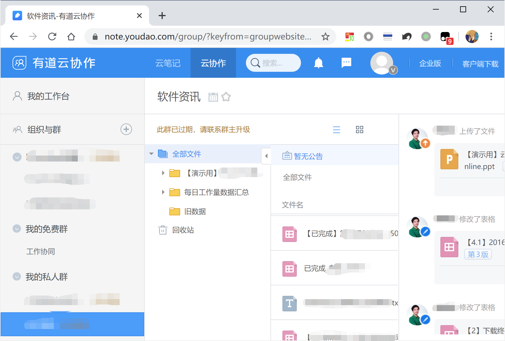 笔者之前就是有道云协作的用户,这次疫情期间在家远程办公,再次使用时,发现以前的群组纷纷到期,功能受限,这也算是有道云协作局限性的体现吧。