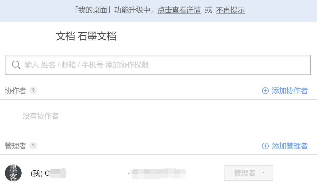 比较值得一提的是,石墨文档的分享、协作权限做了细分。在石墨文档当中,分享和协作被分开,共享文档的链接只能开启只读文档,如果需要他人协作,要通过邮件、手机等渠道邀请协作者。与此同时,协作部份也细分出了管理者和协作者,这有助于将文档协同关系的梳理。