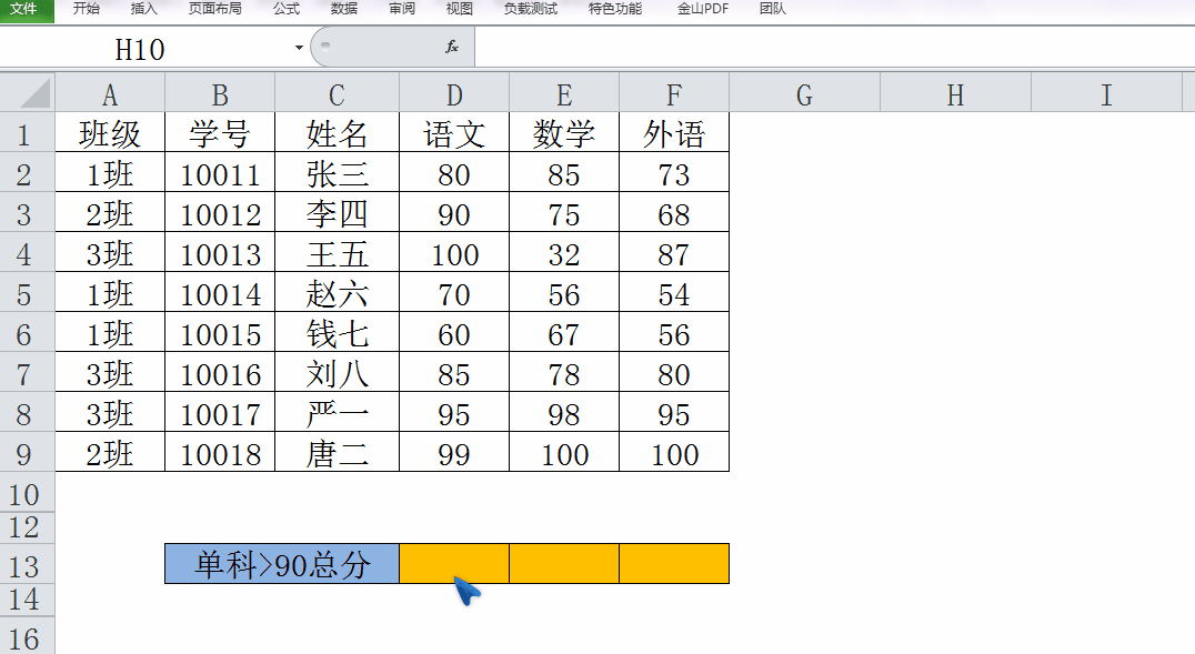 从要求来看,要分别求1班语文、数学、外语三科在90分以上的总分。我们以语文科目为例来进行讲解。
