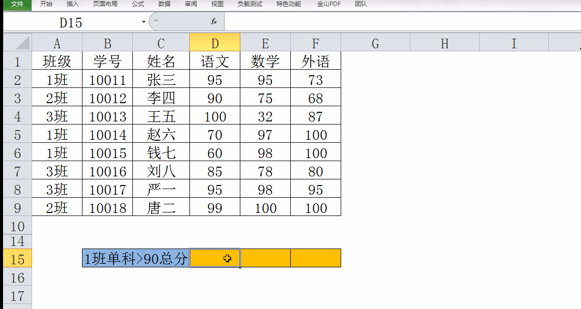于是在D15单元格里面写上公式:=SUMIFS(D2:D9,A2:A9,"1班",D2:D9,">90"),确定即可得到结果95。