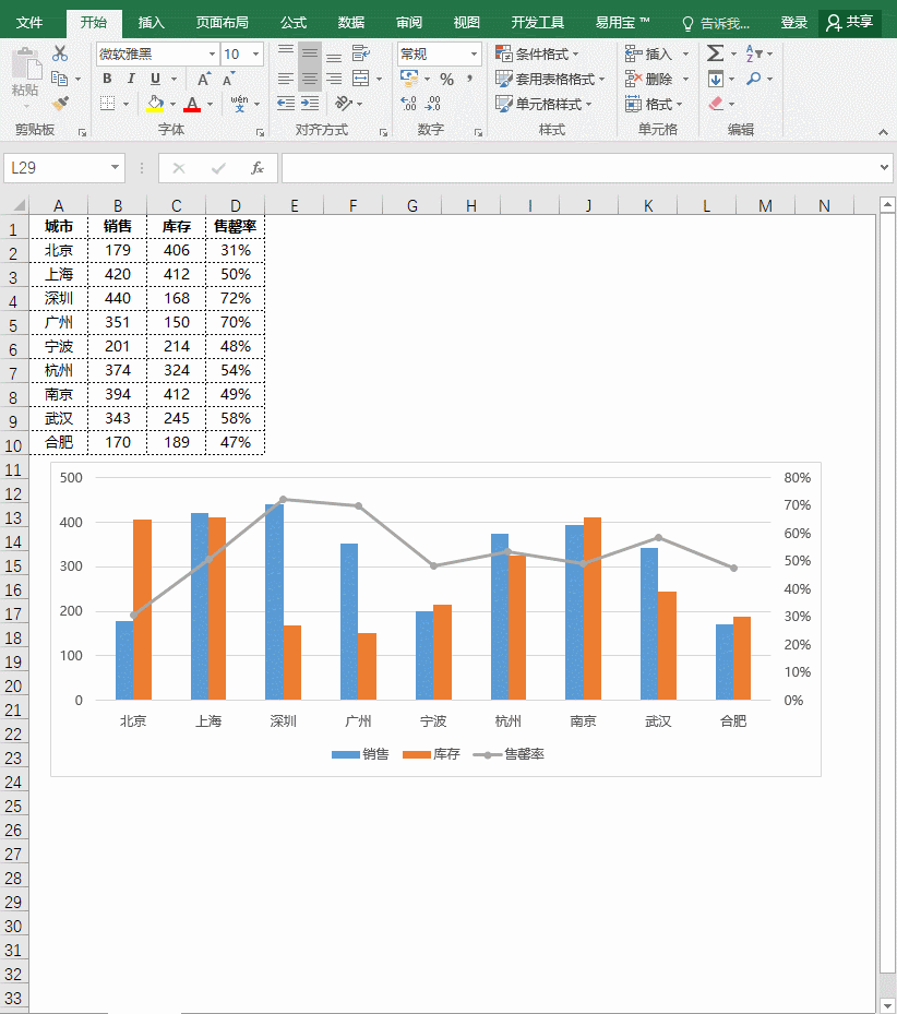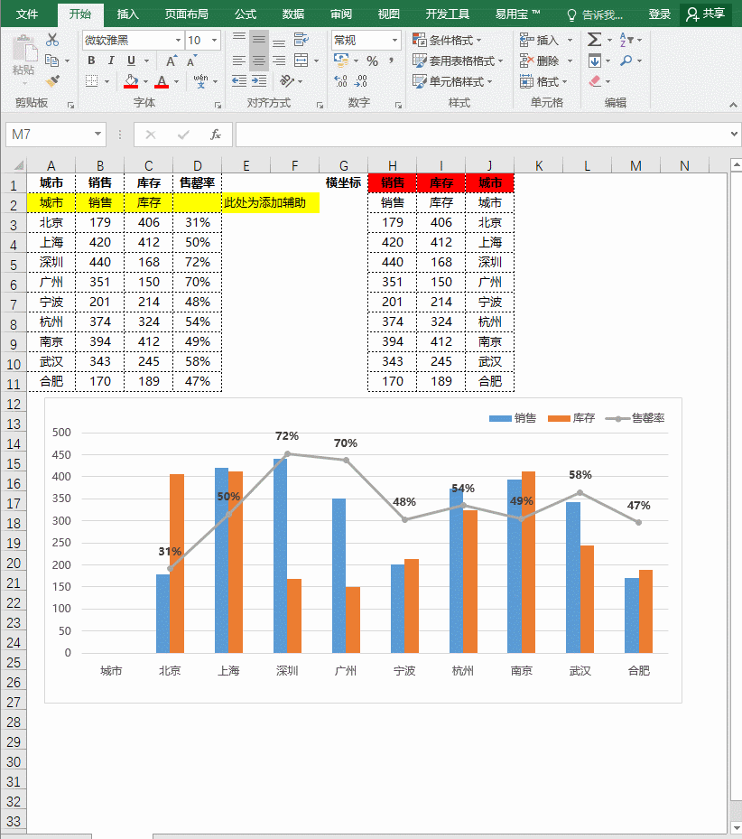 例如,在图表中添加售罄率系列标签,然后让库存和销售显示在数据表位置。