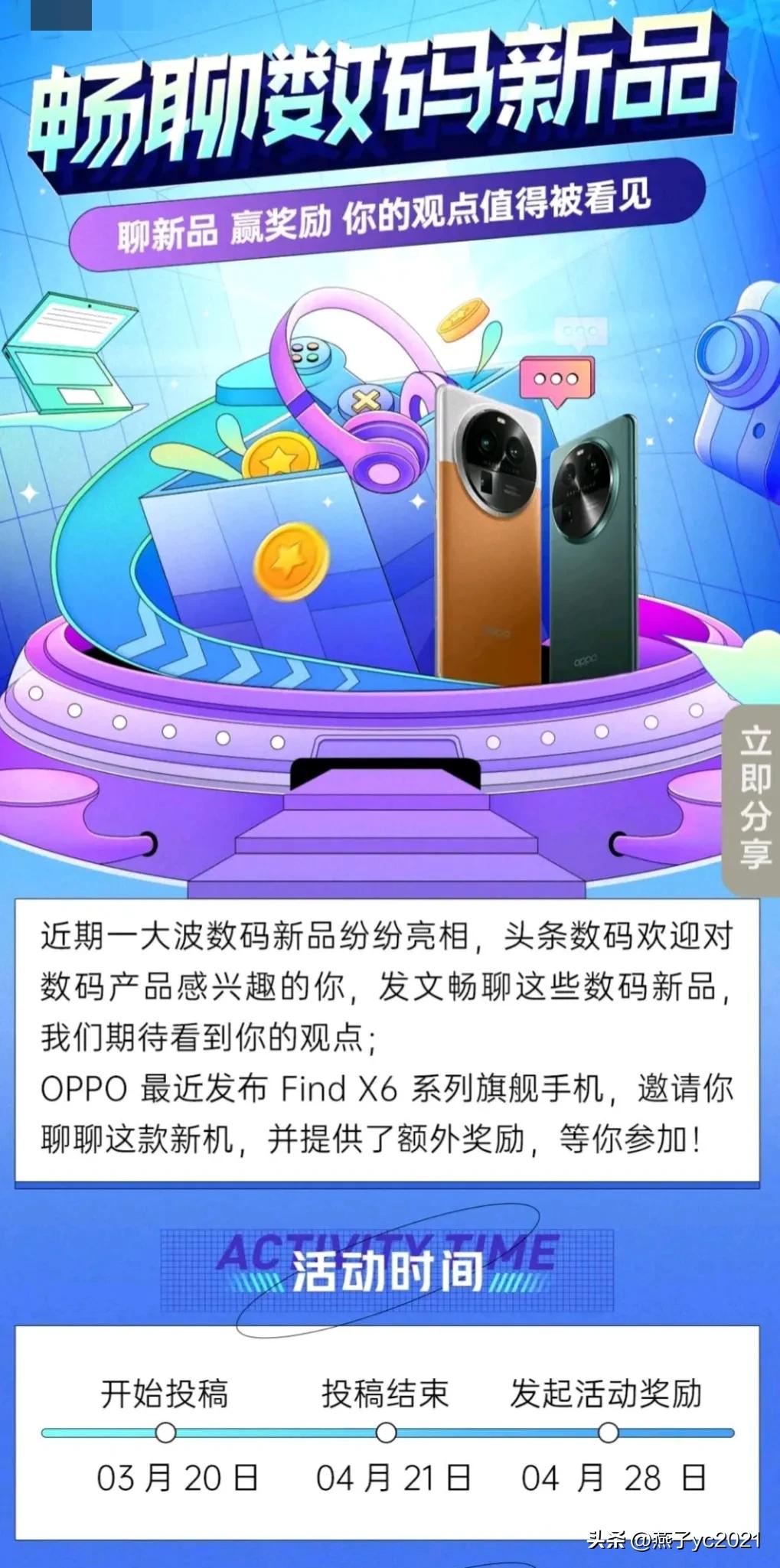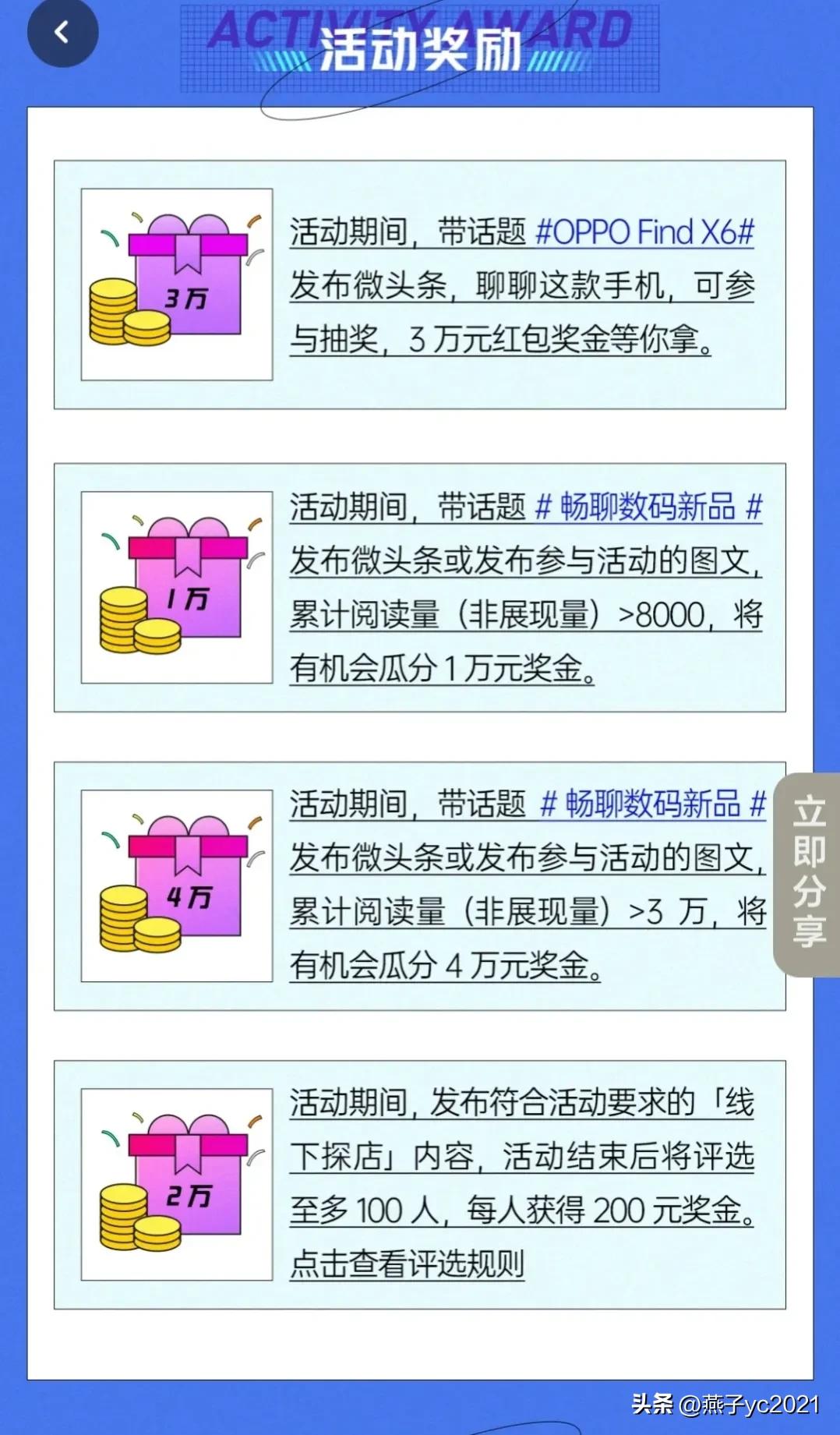 畅聊数码新品这个活动的奖励设置还蛮丰厚的。除了头条平台提供的2个档次的瓜分奖励以外,OPPO还提供了抽奖和探店两款额外的奖励!