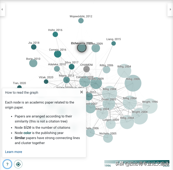 看不懂图片可以直接点击帮助图标,每一个节点代表一篇文献,节点大小表示文献被引量多寡,节点颜色由浅入深表示年代由远及近,节点之间连线越深暗示两篇文献之间相似度越高,同时相似度高的文献会在图片中聚集在一起。具黑色环带的节点示原始文献,鼠标滑过非原始文献的节点均会产生白色环带予以区分。